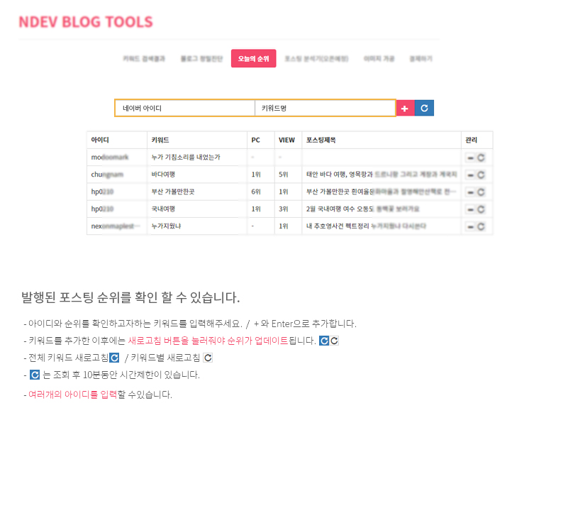 | 순위 | 분류 | 아이디 | 이름 | 제목 | 작성일 | 노출기간 | 지수 | 정밀진단 |